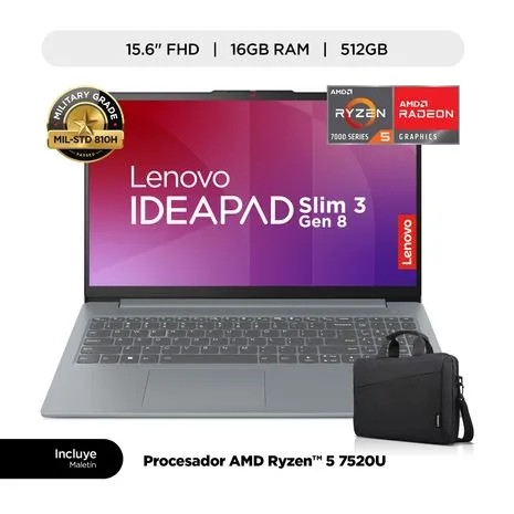 LAPTOP, LENOVO, IP SLIM 3 RYZEN 5 7520U 8GB DDR5 512GB 15.6P FHD + MALETIN